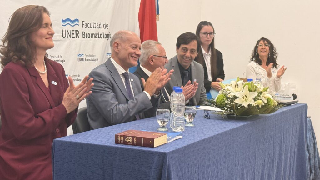 Asimismo, se realizó un reconocimiento al decano saliente, Lic. Gustavo Isaack, a quien se le hizo entrega de un presente institucional en agradecimiento por su labor y compromiso durante su gestión. Del mismo modo, el Colegio de Licenciados en Bromatología de Entre Ríos hizo entrega de presentes a las autoridades, a través de su presidente, Lic. Edgar Raimondo.