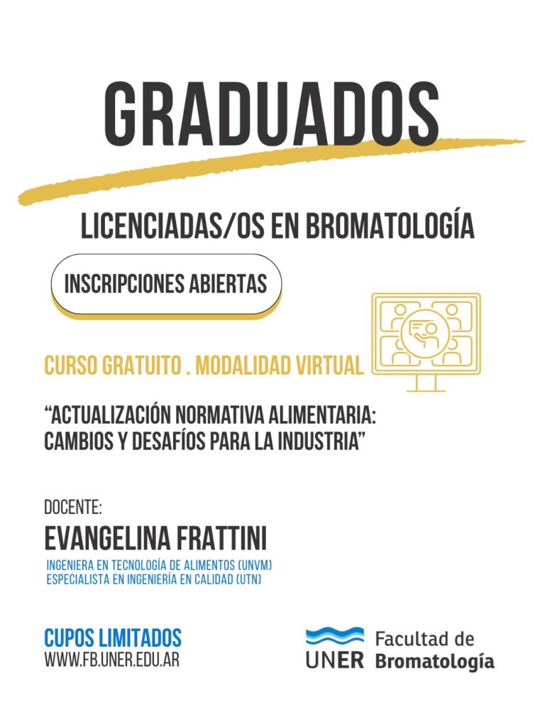 Curso para graduados “Actualización Normativa Alimentaria: Cambios y desafíos para la Industria”, aprobado por Res. CD 118/2025 y Res. DEC Nº 481/2025; destinado a graduados/as de la Lic. en Bromatología.