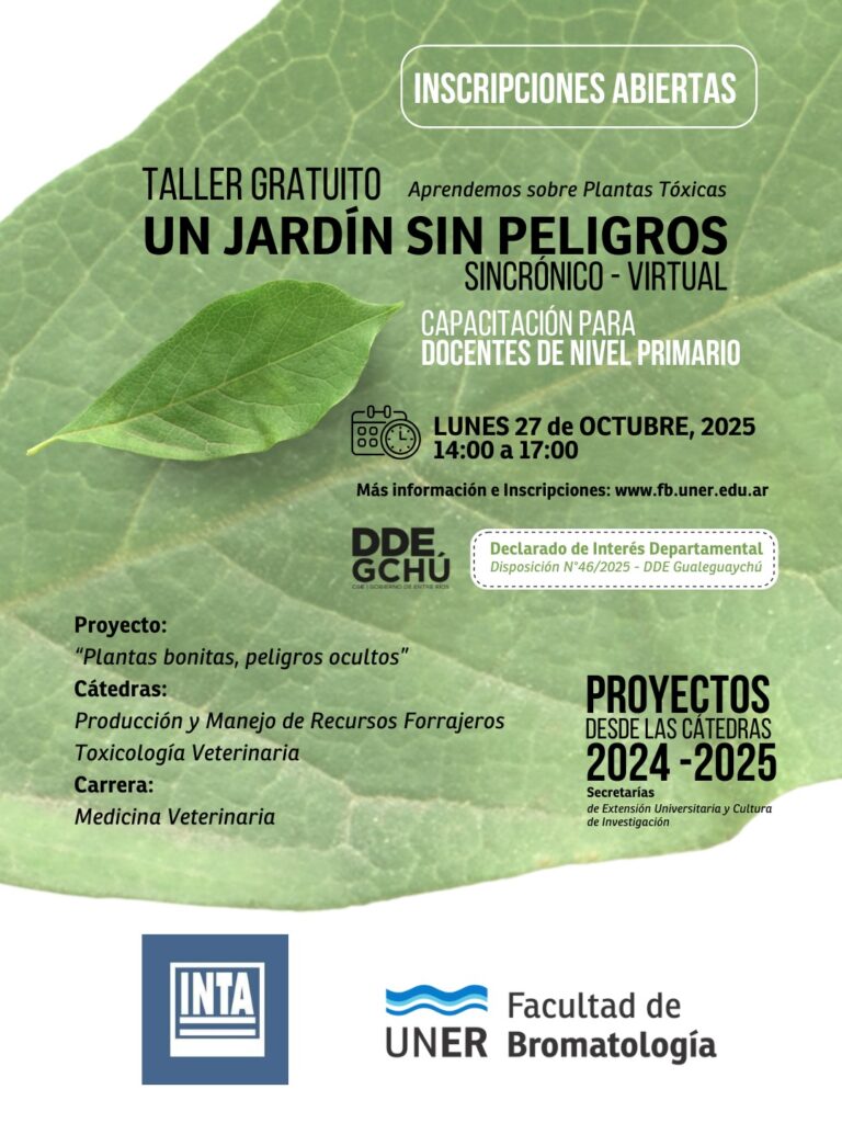 El próximo lunes 27 de octubre, de 14:00 a 17:00, se llevará a cabo el Taller virtual: “Un Jardín Sin Peligros: Aprendemos sobre Plantas Tóxicas”, destinado a docentes de nivel primario de escuelas públicas del departamento Gualeguaychú, en el marco del Proyecto desde las Cátedras “Plantas bonitas, peligros ocultos”, dirigido por el estudiante Pedro Weigandt, aprobado por Res. CD 260/2024, Secretaría de Extensión Universitaria y Cultura y la Secretaría de Investigación, declarado de Interés Departamental por la Dirección Departamental de Escuelas de Gualeguaychú (Dis. 46/2025).